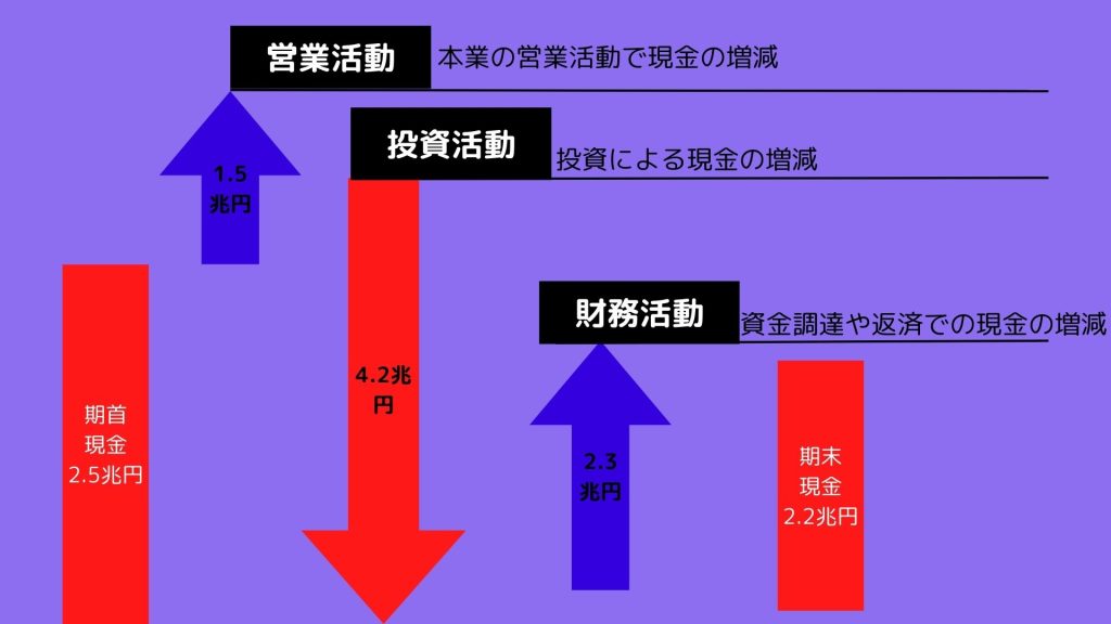 ただキャッシュフロー計算書というのは企業の経営状況を表しているので、どういうことにお金をかけて、どうしていきたいのかといったことがわかります。図解にするとこんなイメージです。