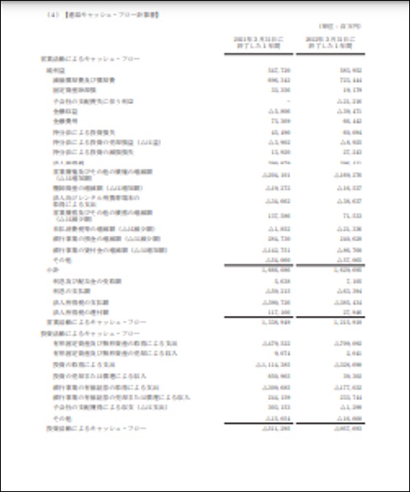 この画像はソフトバンク株式会社が公表しているキャッシュフロー表の一部です。様々な項目に細かく数字が書かれており一見するだけでは難しそうな感じです。(めっちゃぼけていますがお許しください。特に数字については触れないですが、何となく細かな項目があり数字が並んでいるなぁと思って下さい)