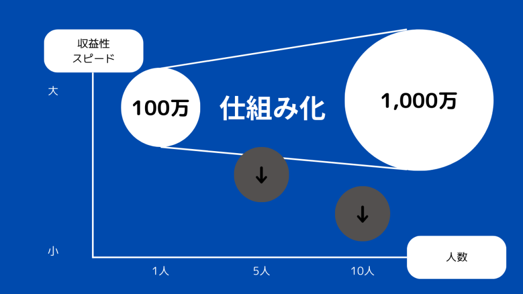 まず仕組み化については「仕組み化=事業スピードと収益性を保ったまま拡大を行うための方法」と定義します。どういうことかと言うと、例えば何らかの事業で1人で100万の売上を達成。そこから拡大しようと5人の従業員を増やした、もっと拡大しようと10人の従業員を増やした。そのような時に仕組み化が出来ていなければ基本的には1人当たりの売上は下がってしまいます。