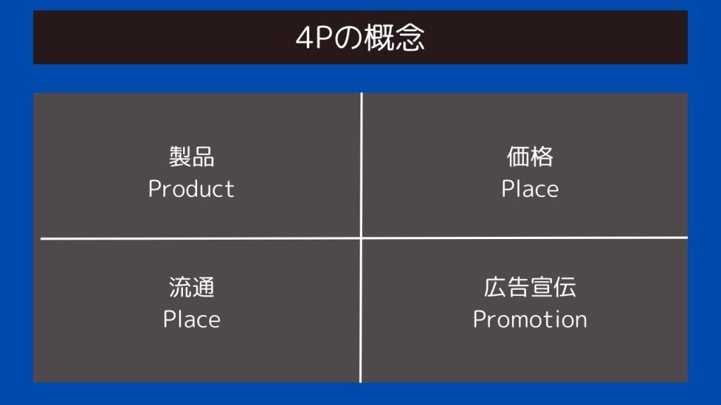 そんなこんなで、2Pという製品(Product)・価格(Price)を重んじる時代から、4P(製品(Product)・価格(Price)・流通(Place)・広告宣伝(Promotion))という概念が登場します。