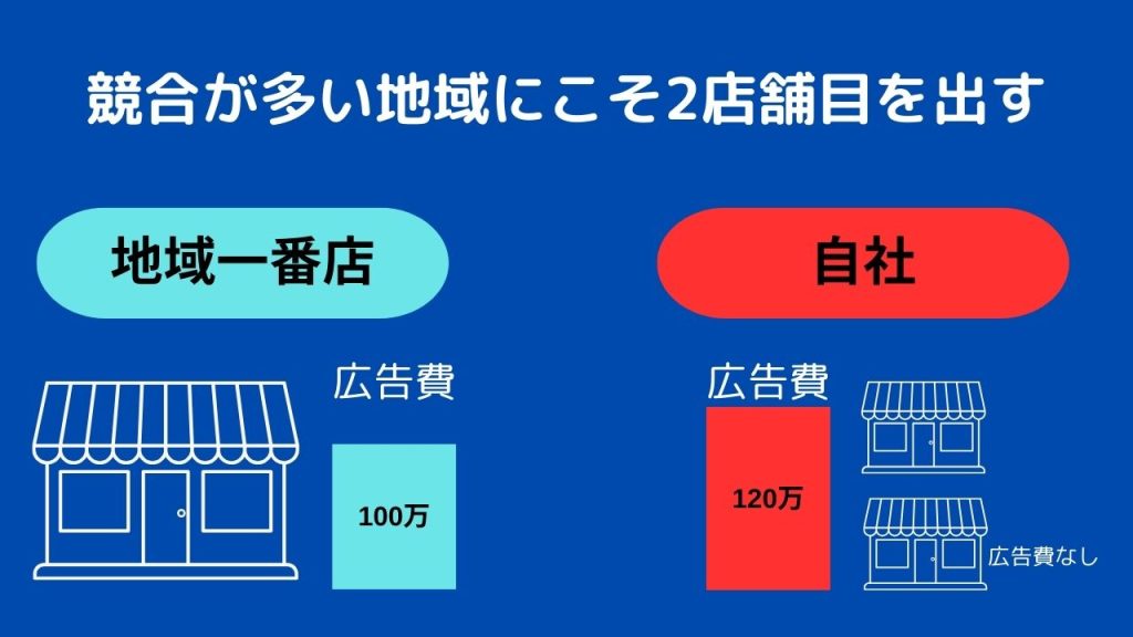 そのエリアの競合である地域一番店は月に100万円の広告費をかけていたとしましょう。そこであなたのお店はエリアに2店舗あるとした時に1店舗当たりに広告費を軽減することが可能です。理由としては同じエリアであれば2店舗分の広告費を合算することが可能だからです。例えば1店舗当たり60万ほどの広告費でも2店舗で120万になる為、競合よりも多く広告費をかけ2店舗でエリアのお客様を分け合うことが可能なのです。