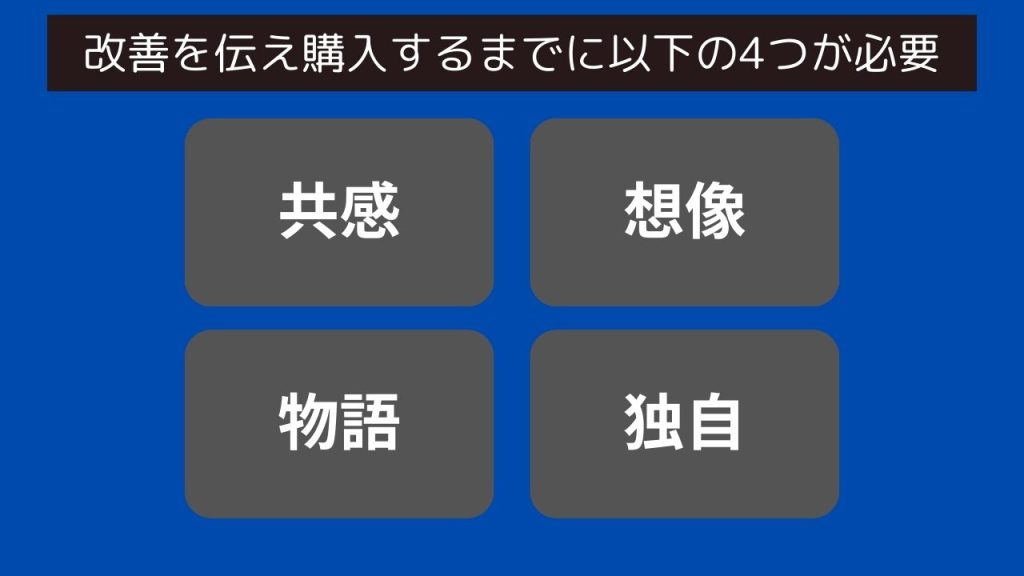 改善をどのような要素で伝えていけばよいのかというと、共感・想像・物語・独自の4つです。この要素について一つずつ説明します。