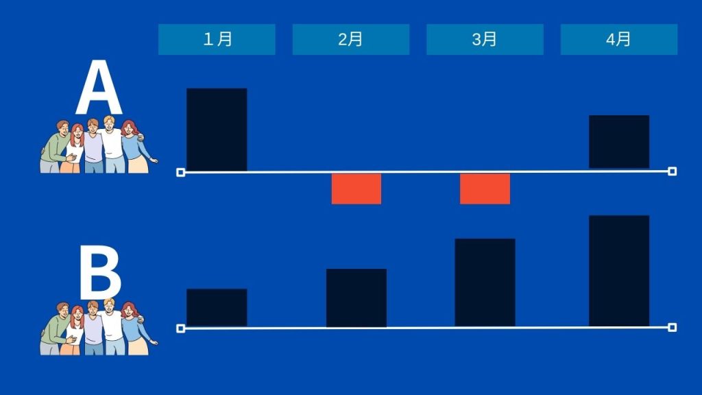 例えばA社は黒字の月もあれば赤字の月もあります。B社は赤字は無いがゆっくり売上を上げています。どっちが健全な経営かというと、もちろんB社になります。