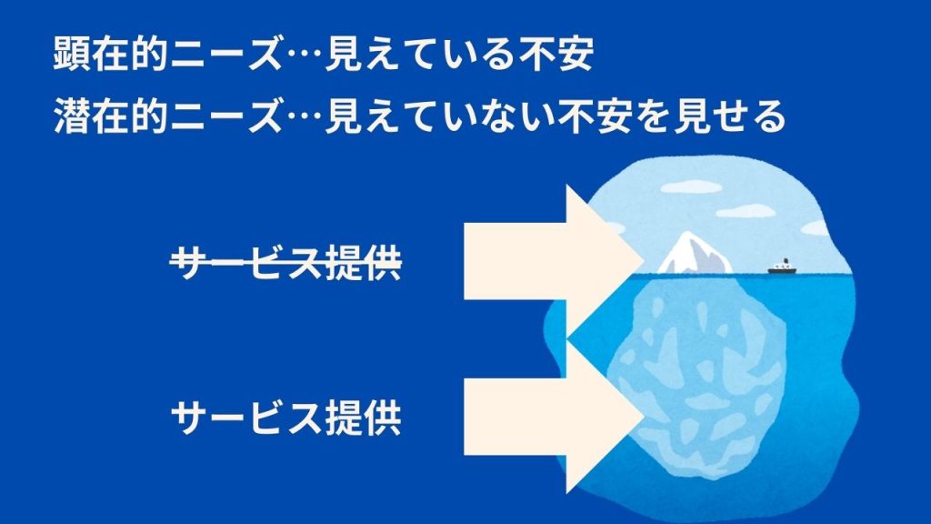 多くのサービス提供というのは見えている不安に対して、解決策を提示しているから売上が伸び悩んだりします。購買意欲がわかないという訳です。なぜなら上記のように見えている範囲は狭いからです。