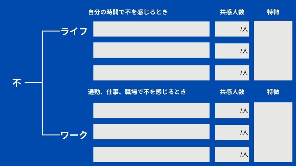 このフレームワークをもとに生きていて不満に感じることを書き出していきます。それらに対し、周りにいる人たちがどれだけ共感したかを書いていきます。そして共感した人の特徴を書いていきます。