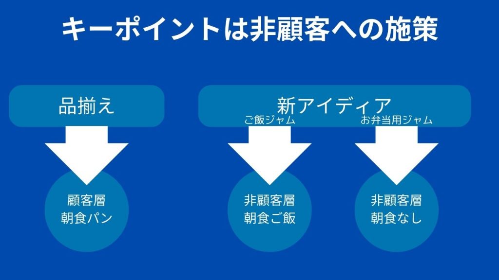 先ほどのジャムを例に出すと、パンを食べる人が顧客と考えがちですがパン以外を食べる人(非顧客)を考える必要があります。この非顧客のことを考えることがキーポイントになります。
