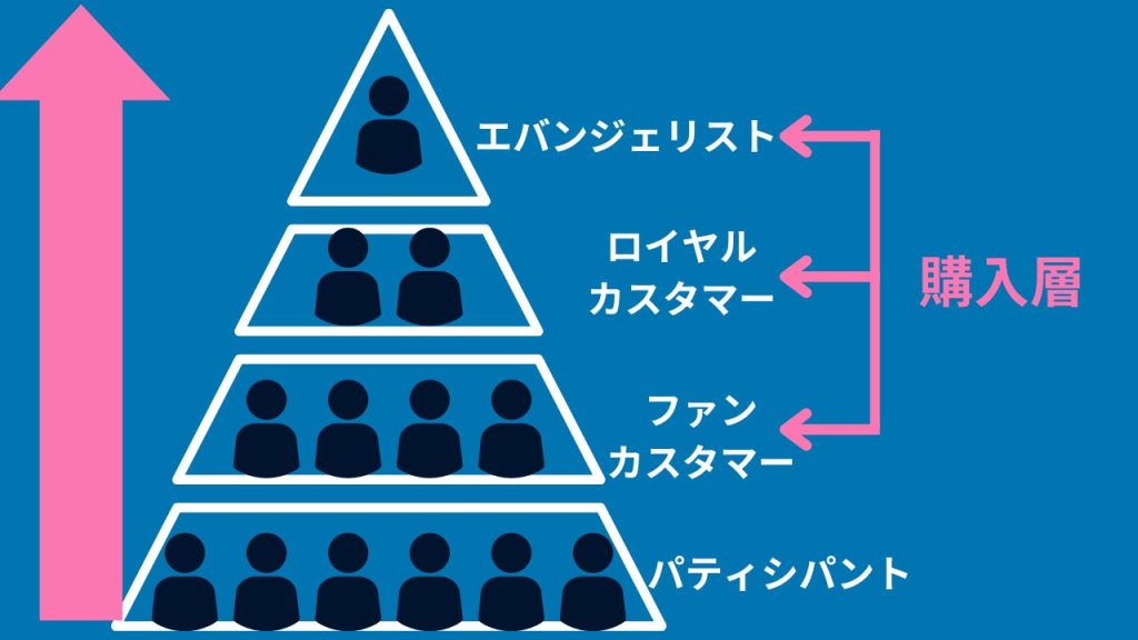 パティシパントは「参加者」、ファンカスタマーは「購入して参加する人」、ロイヤルカスタマーは「継続的にリピート購入し、シェアしてくれる人」、エバンジェリストは「お店と一体となって広めてくれる人たち」と定義できます。