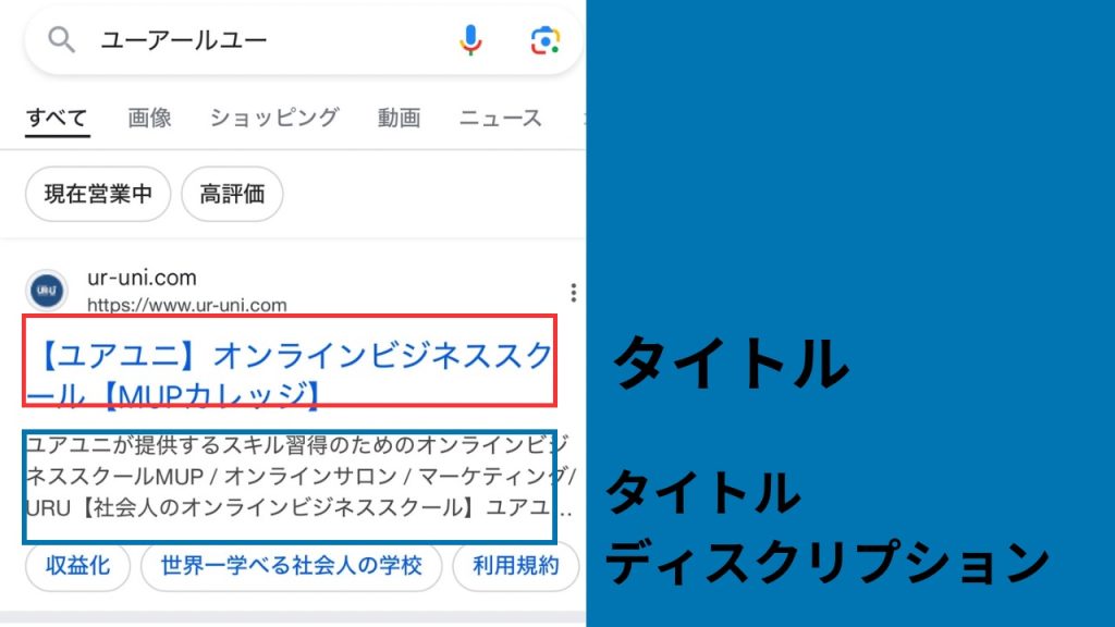 これはCTRを高める為のサイトのタイトル(赤)/タイトルディスクリプション(青)を改善することがCTRを高めることに繋がります。なのでキャッチコピー力というのが重要というのが理解できると思います。